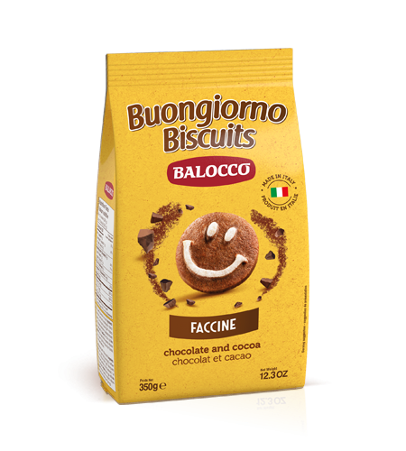 Les Faccine de Balocco sont de délicieux biscuits sablés au cacao, amusants et gourmands, qui allient le goût intense du chocolat à une présentation ludique. Leur texture croquante et leur saveur irrésistible en font le compagnon idéal du petit-déjeuner ou d’une pause gourmande. Fidèle à son savoir-faire, Balocco propose une recette authentique, sans additifs, sans colorants, sans graisses hydrogénées et sans ingrédients génétiquement modifiés.
