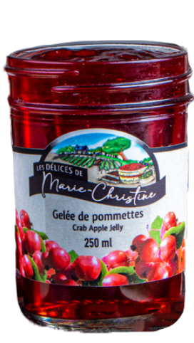 Délicate, acidulée et pleine de caractère, la gelée de pommettes de Les Délices de Marie-Christine est une véritable spécialité du terroir québécois. Élaborée à partir de petites pommes sauvages cueillies à maturité, elle dévoile une belle robe rouge translucide et une saveur fruitée bien équilibrée entre douceur et vivacité.