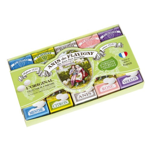 Redécouvrez la tradition française avec ce coffret de 5 étuis de bonbons Anis de Flavigny, délicats et parfumés, présentés dans de jolis formats de poche. Chaque étui de 18g renferme un parfum emblématique : Anis, Violette, Rose, Menthe et Citron.
