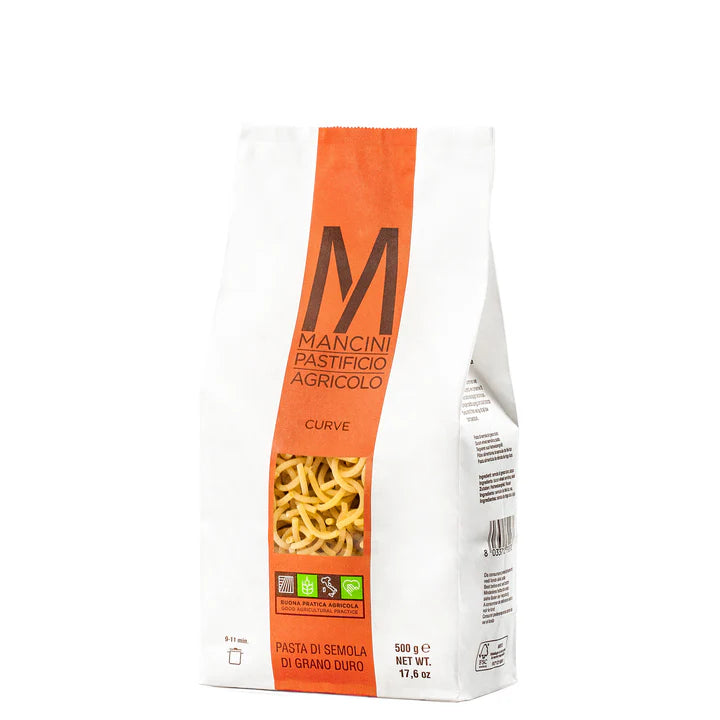 Les Curve Mancini sont de courtes pâtes à la forme légèrement arquée, façonnées dans des filières en bronze pour une surface rugueuse qui retient parfaitement les sauces.