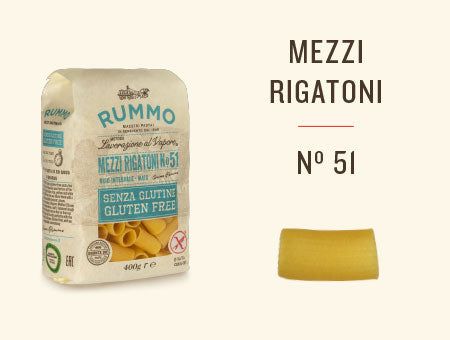 Les Mezzi Rigatoni sont fabriquées à partir de maïs et de riz complet, mélangés selon le procédé exclusif « Metodo di Lavorazione al Vapore® », pour une pâte crémeuse, équilibrée et d’une consistance incomparable.