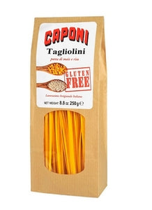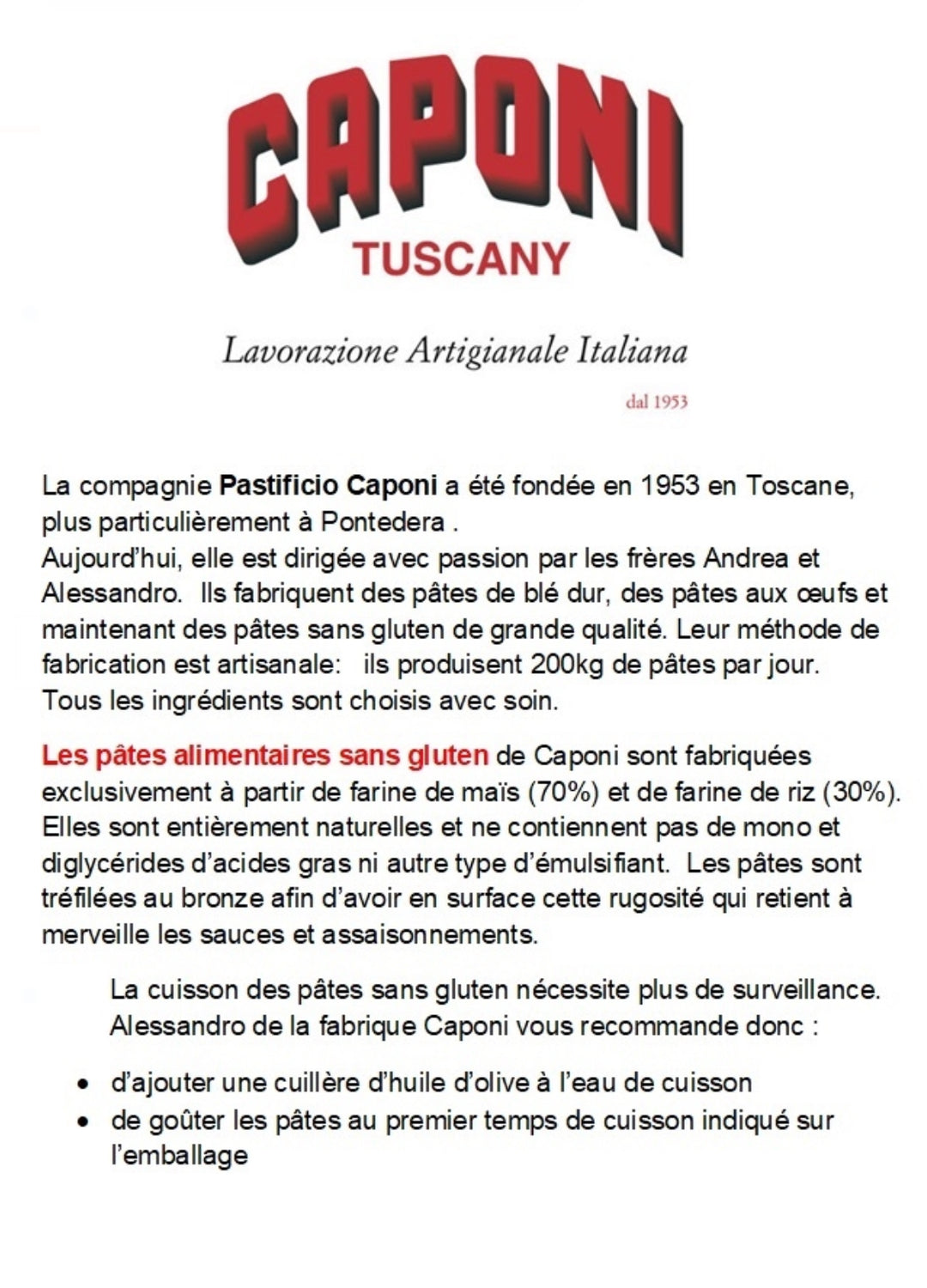 Les pâtes alimentaires sans gluten de CAPONI sont fabriquées exclusivement à partir de farine de maïs (70%) et de farine de riz (30%). Elles sont entièrement naturelles et ne contiennent pas de mono et diglycérides d'acides gras ni autre type d'émulsifiant. Les pâtes sont tréfilées au bronze afin d'avoir en surface cette rugosité qui retient à merveille les sauces et assaisonnements.
