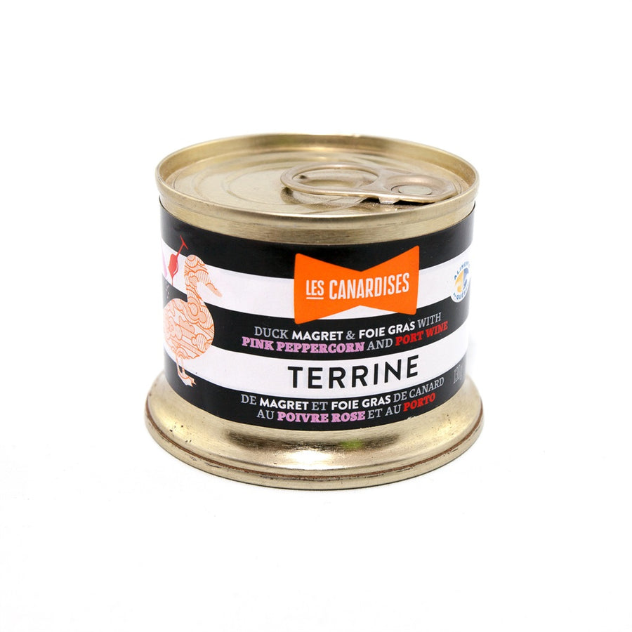 La Terrine de Canard et Foie Gras au Poivre Rose & Porto - Canardises (150 g) est une délicieuse préparation qui combine l'onctuosité du foie gras de canard avec les saveurs subtiles et légèrement épicées du poivre rose, relevées par la douceur du Porto. Un mariage de saveurs parfait pour une entrée raffinée ou un apéritif gastronomique.