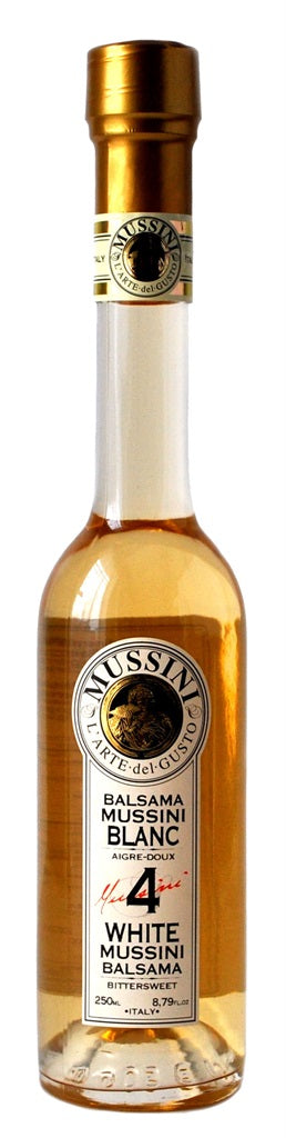 Élaboré à partir de vinaigre de vin blanc et de moût de raisin concentré, ce condiment blanc de la Série 4 offre un équilibre parfait entre douceur fruitée et légère acidité. Sa robe claire et brillante en fait un assaisonnement idéal pour les plats où la couleur du vinaigre classique n’est pas souhaitée, tout en conservant la richesse aromatique typique des produits Mussini.
