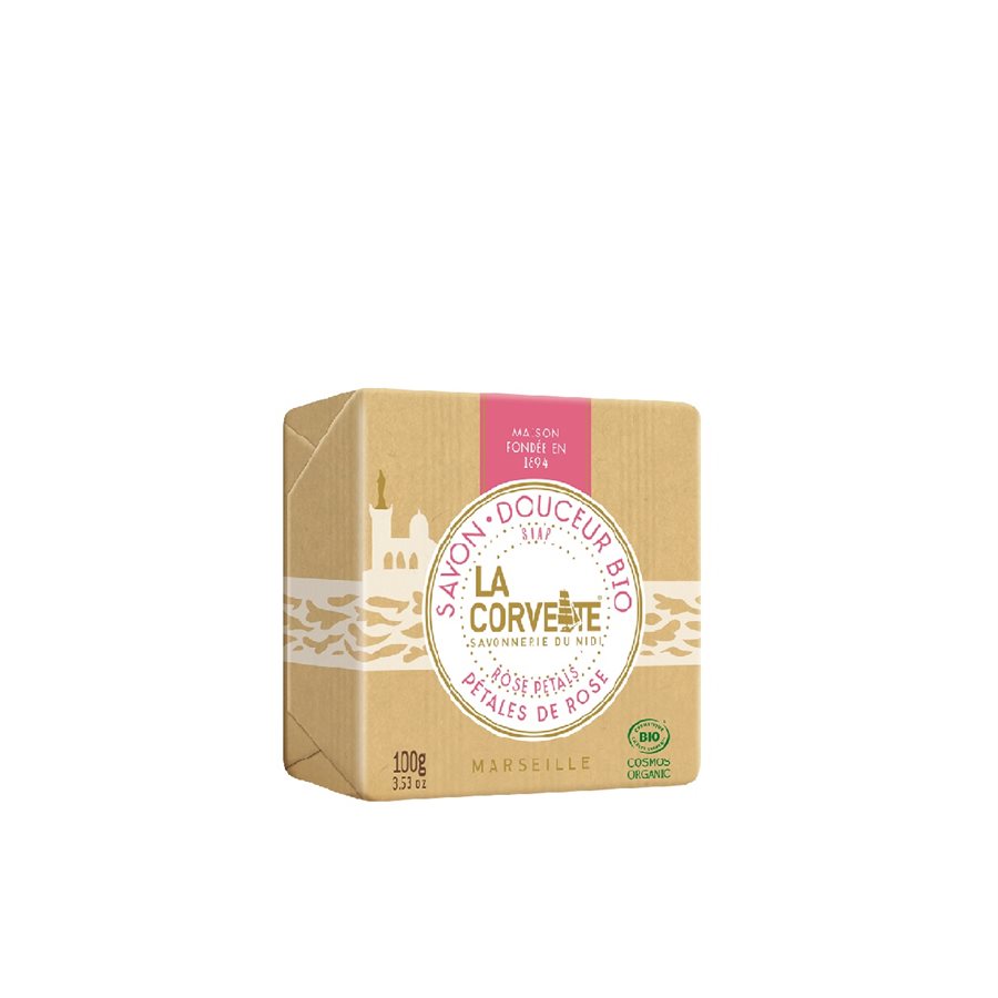 Organic Sweetness Rose Petals soap, made from organic vegetable oils and certified Cosmos Organic.