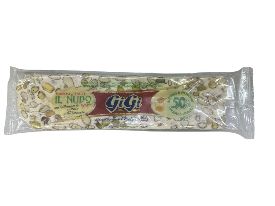 The Premium Soft Nougat with Roasted Almonds and Pistachios Il Nudo Soft Gigi is a high quality artisanal confectionery, which stands out for its soft and melting texture, combined with noble and tasty ingredients. This nougat is prepared with honey, sugar, egg whites and roasted almonds, offering a richness of flavors thanks to the delicately toasted almonds and pistachios that bring a subtly sweet and slightly salty touch.